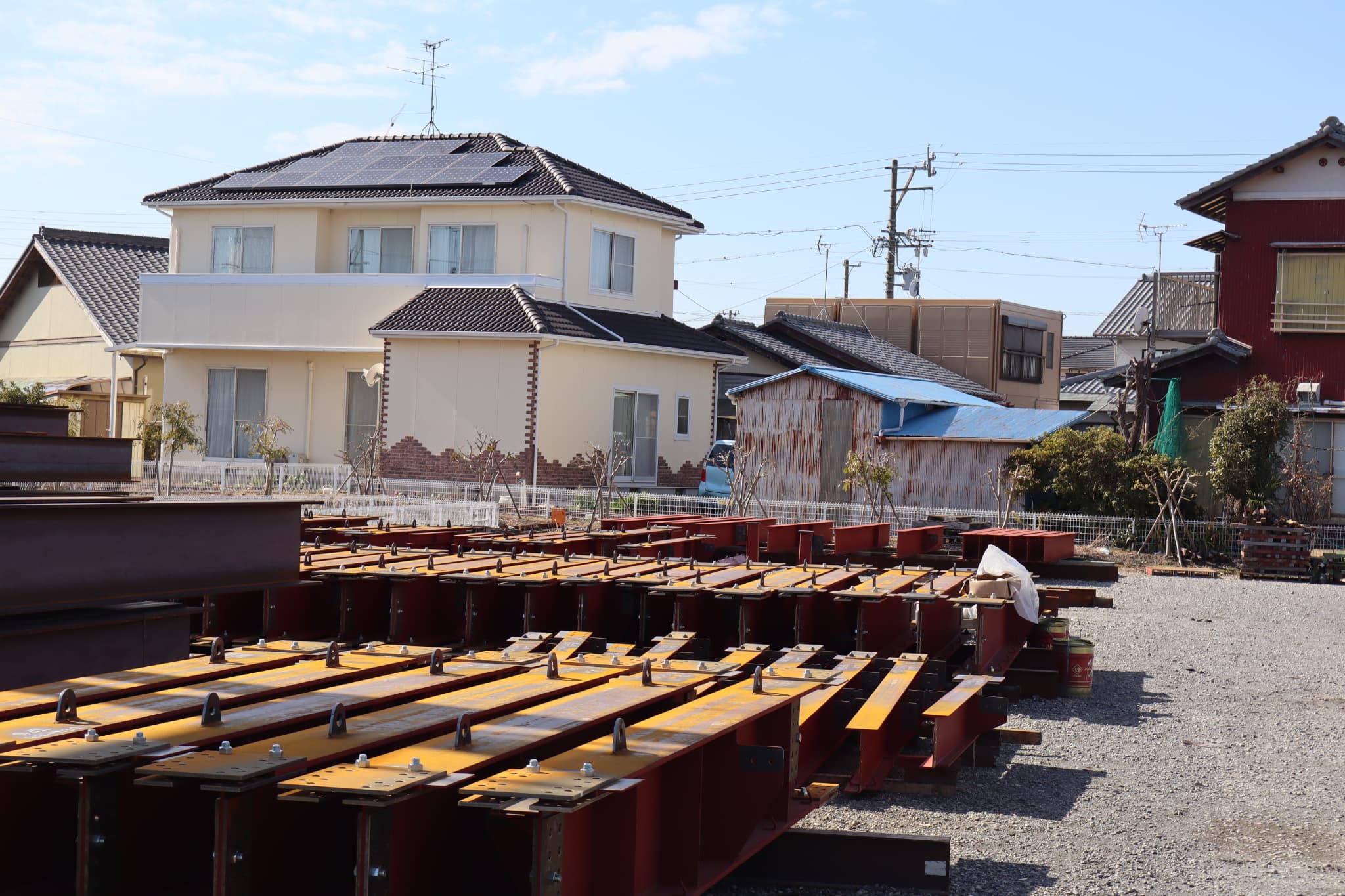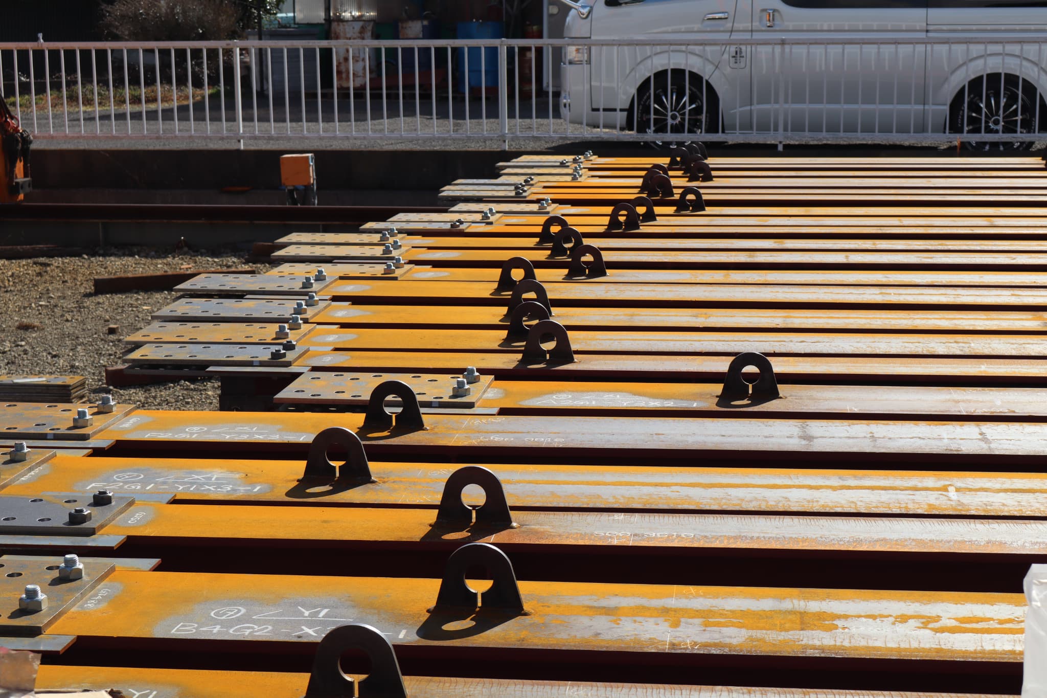 大石ユニオン株式会社では、鉄骨梁の孔あけ加工・部品溶接・錆止め塗装を自社工場にて一貫して対応しています。製作品は品番を明示した状態で整列・管理し、搬出に備えています。